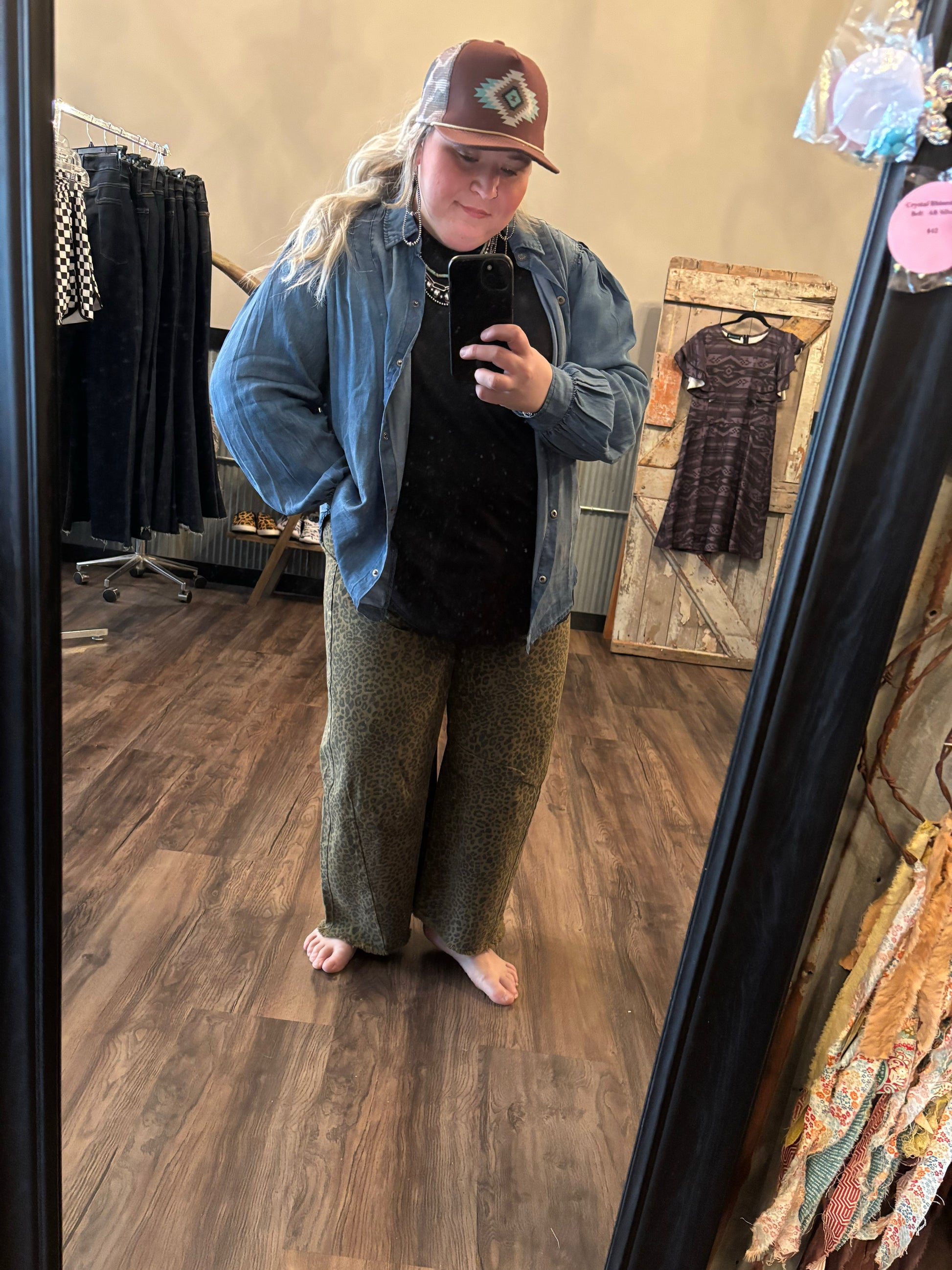 These trendy cheetah print barrel jeans are IT! Fits the body perfectly! Sleek high waisted fit design, and non stretchy denim that fits like a dream! Wide-legs that slightly taper at the ankle. Darted knees keep the "flare out" form. Features beltloops, detailed seams on sides and a raw hem that can be rolled up or down