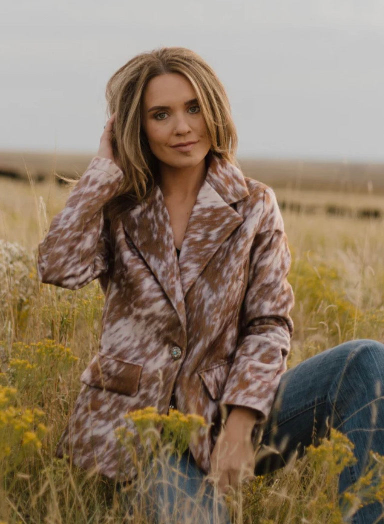 Make a bold statement with the Cows Come Home Blazer, featuring an eye-catching cowhide pattern that adds a unique edge to your wardrobe. Designed to stand out, this blazer effortlessly combines classic tailoring with wild style, perfect for elevating any outfit. Whether at a casual gathering or a night out, this blazer brings confidence and character to your look. NOT real cowhide, just a print, but it feels like hair. The cow print has a slight pink hue which you can see in some of the pictures. This item has no stretch. If you're between sizes, consider sizing down in smaller sizes. For plus sizes, we recommend sticking with your usual size. Just our opinion...