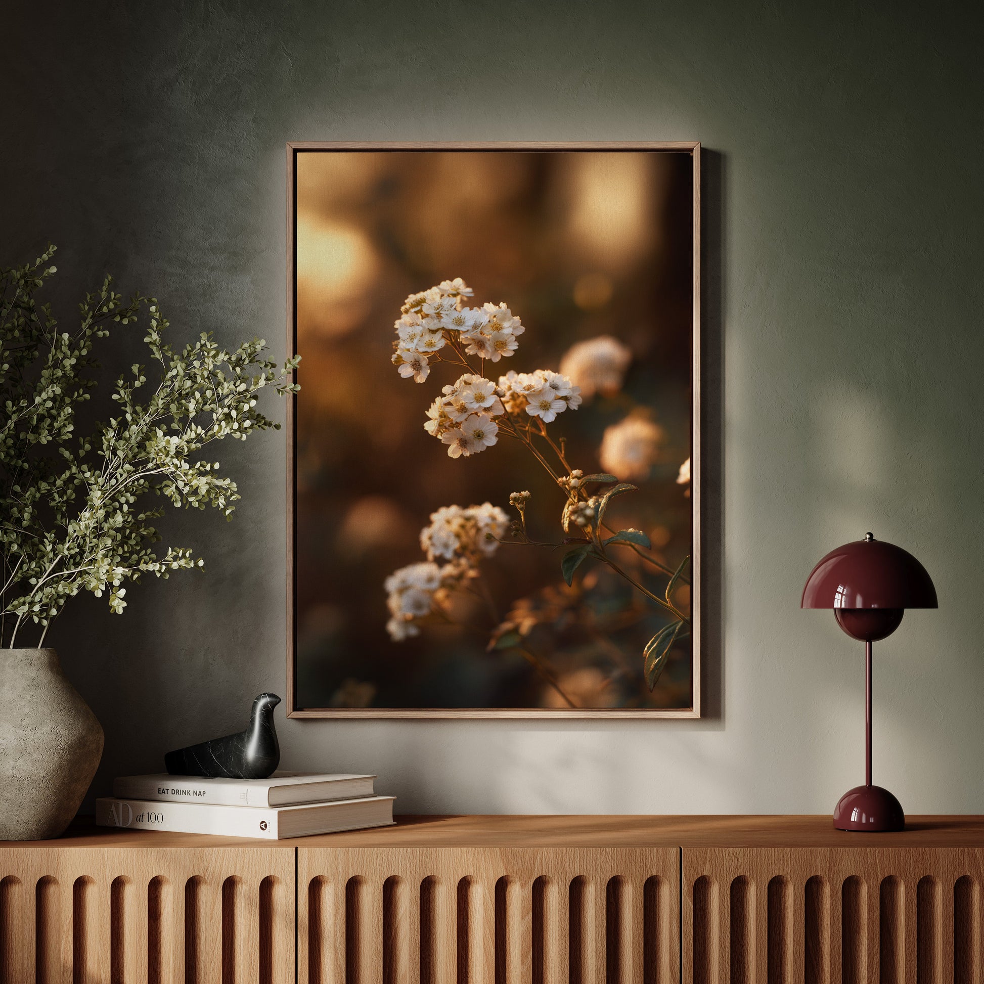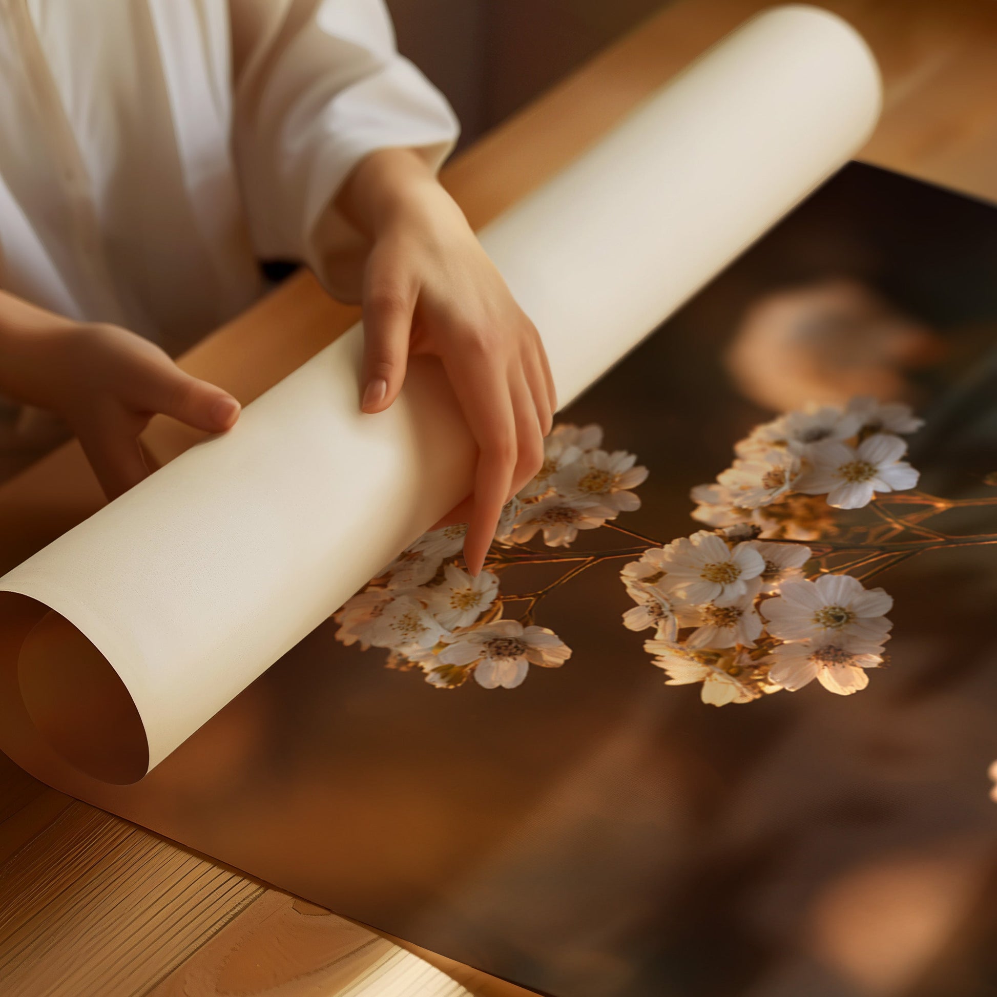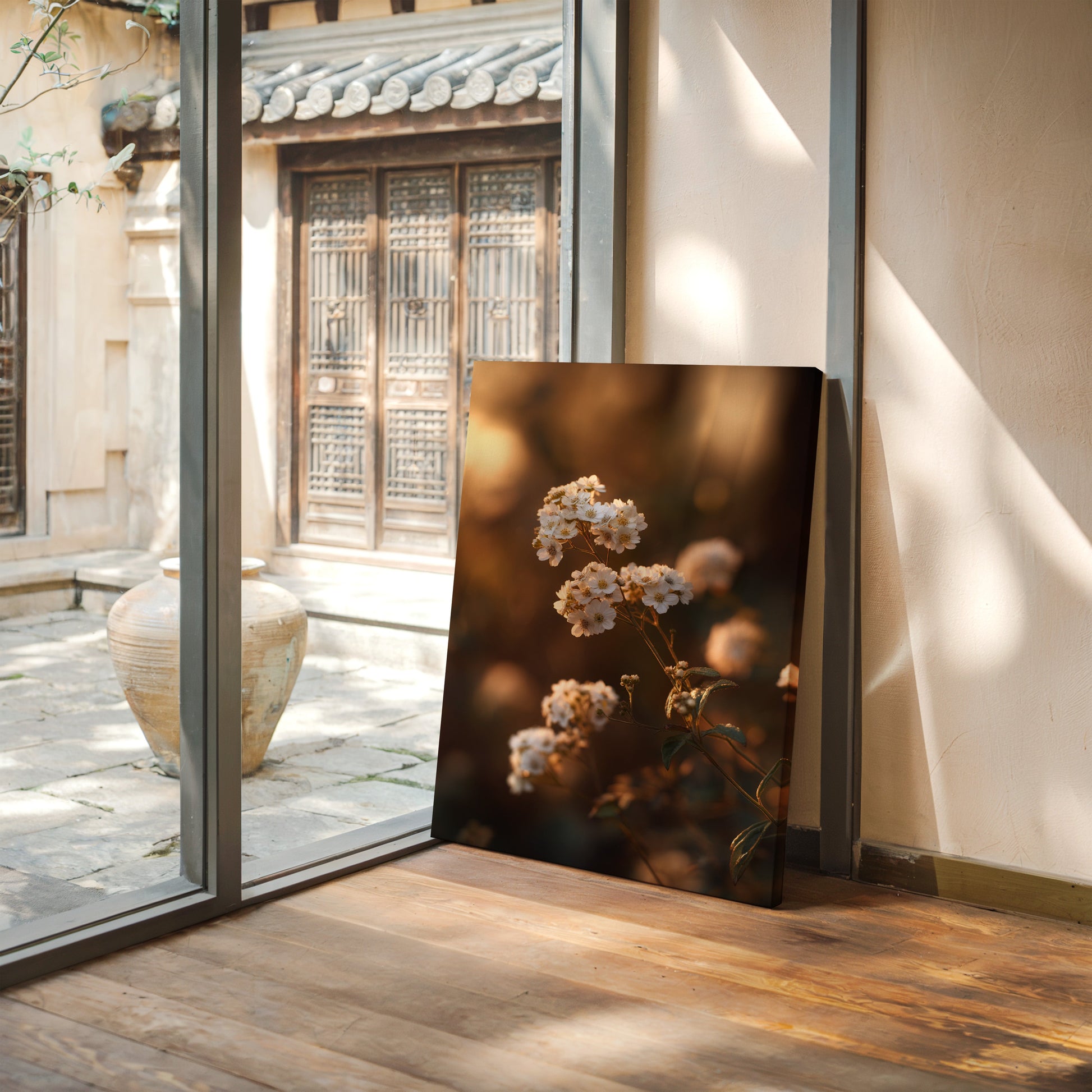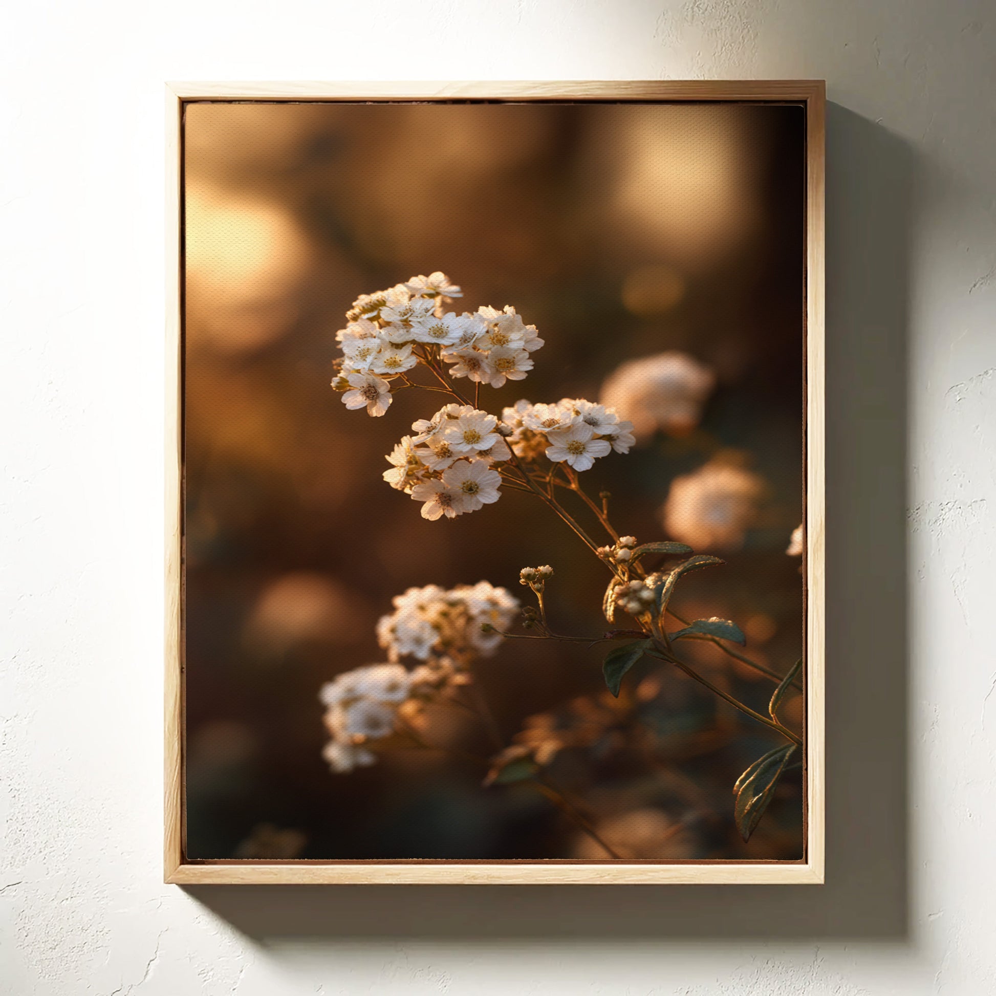 Inspired by the rustic charm of countryside landscapes, this piece transforms delicate florals into timeless works of art. The warm, earthy tones and soft focus create an intimate atmosphere, reminiscent of a peaceful twilight walk.