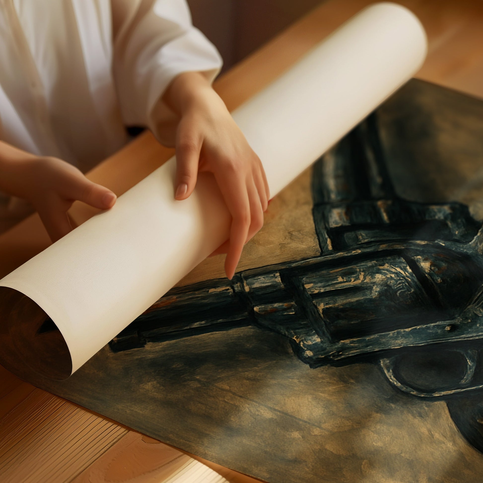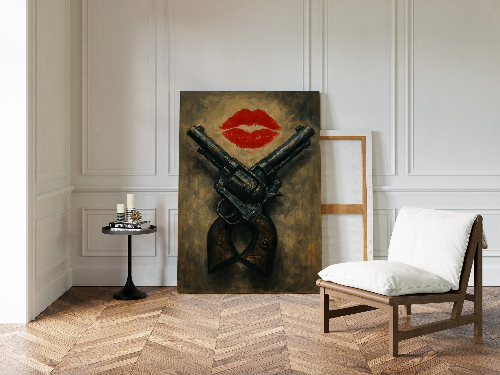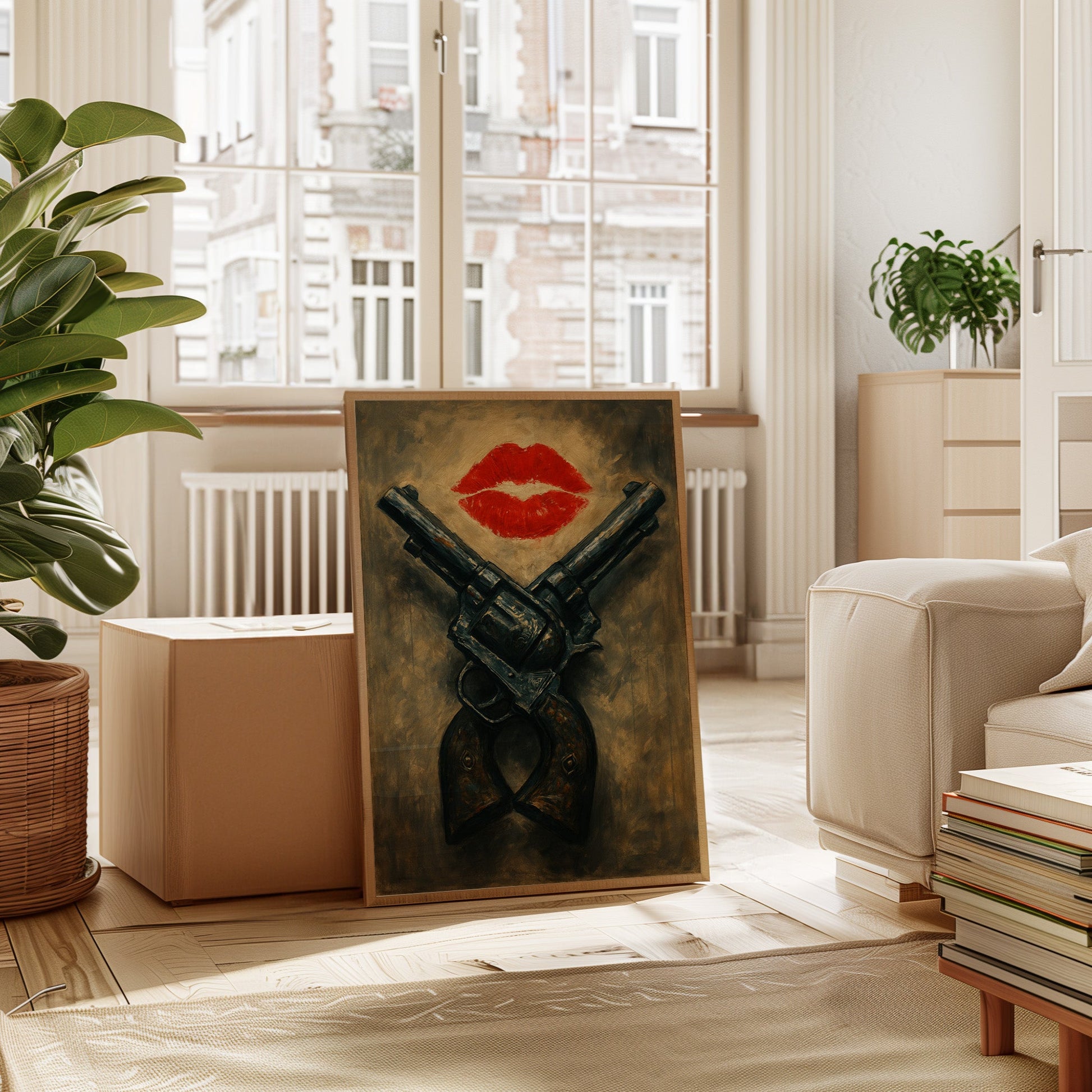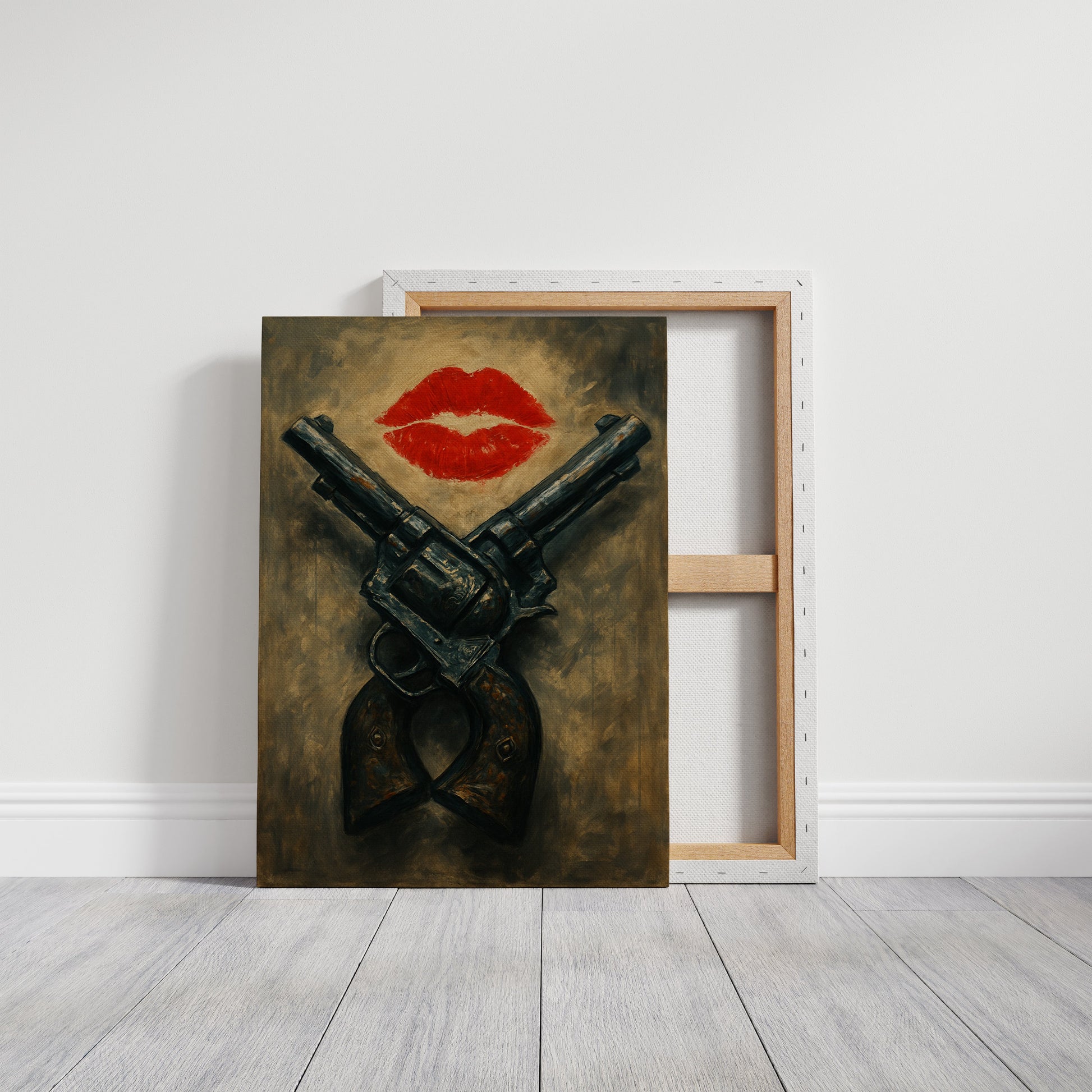 A fiery red kiss meets the grit of crossed pistols in this daring artwork. Moody and provocative, it's where romance flirts with rebellion in painterly, vintage tones.