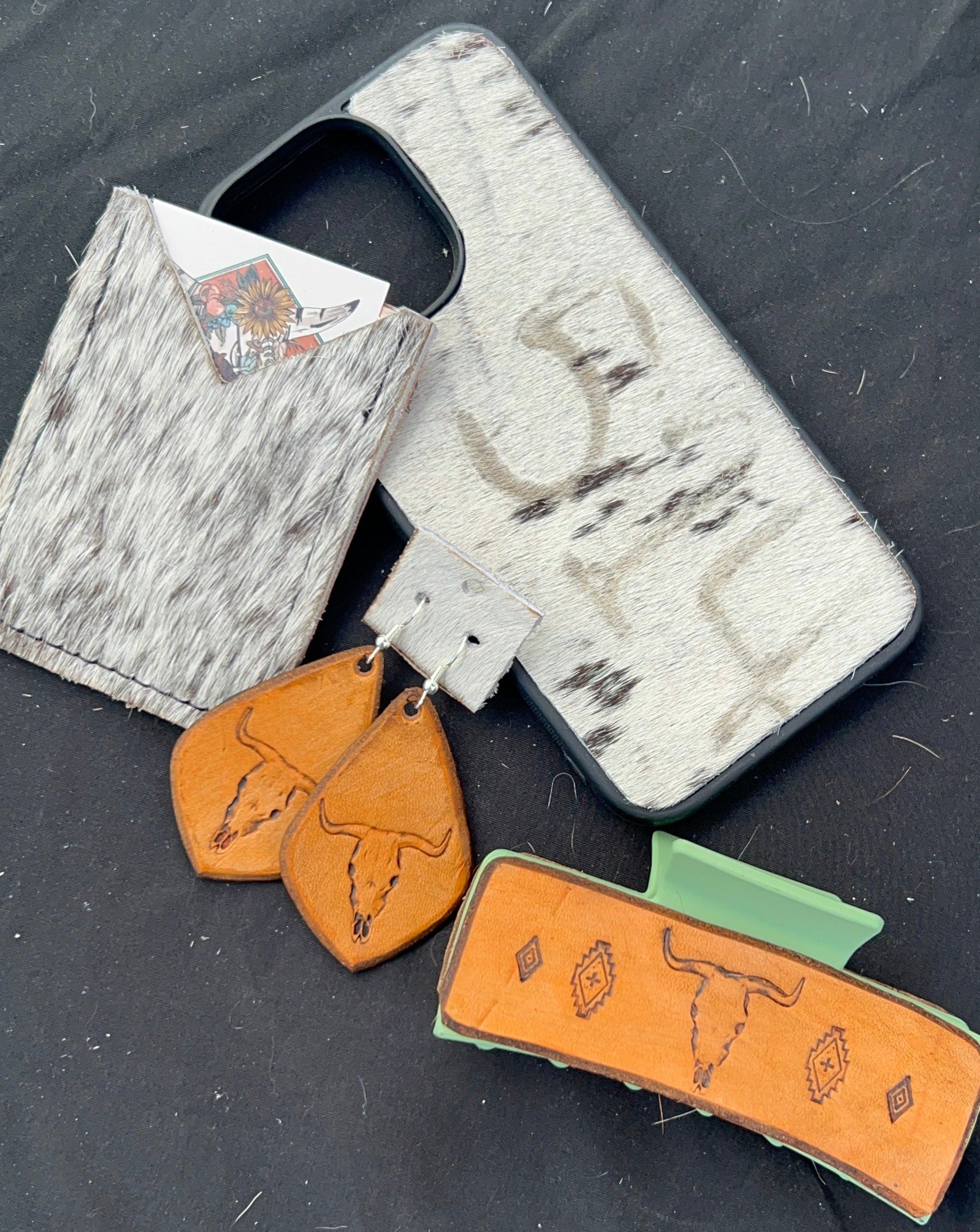 Choose between the plain longhorn earrings and the turquoise spotted longhorn earrings. These earrings are laser engraved on genuine leather and are lighter than you may think.
