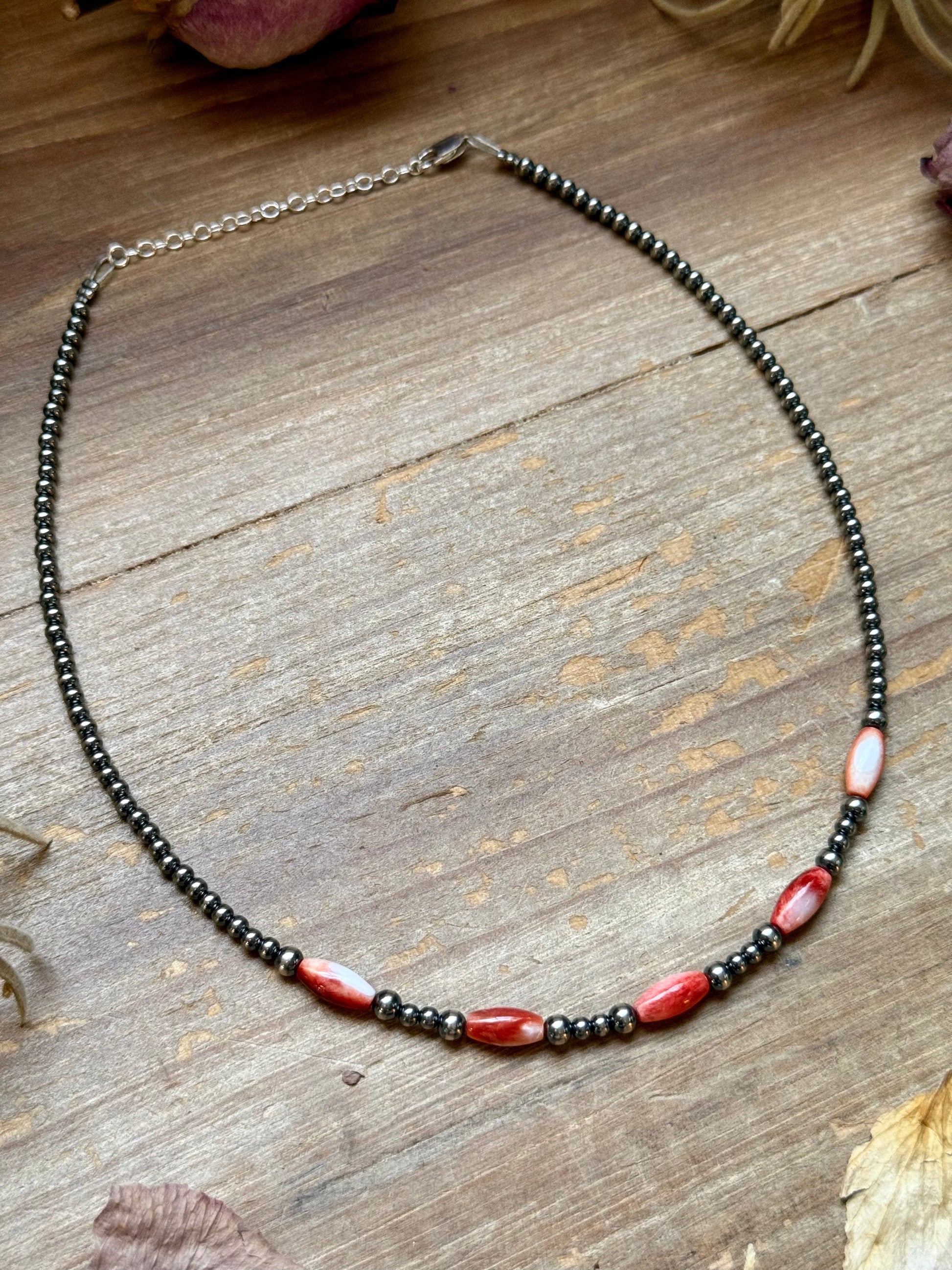 This vibrant Spiny Oyster choker is handmade by The Bijoux FAB using a mix of 3 mm and 4 mm rice-shaped spiny oyster beads in warm shades of orange and red. Each necklace is created with natural shell, so your piece may lean more red or more orange — making every choker beautifully unique. Finished with sterling silver beads, clasp, and a 2-inch extender, it’s easy to adjust and perfect for layering or wearing solo.