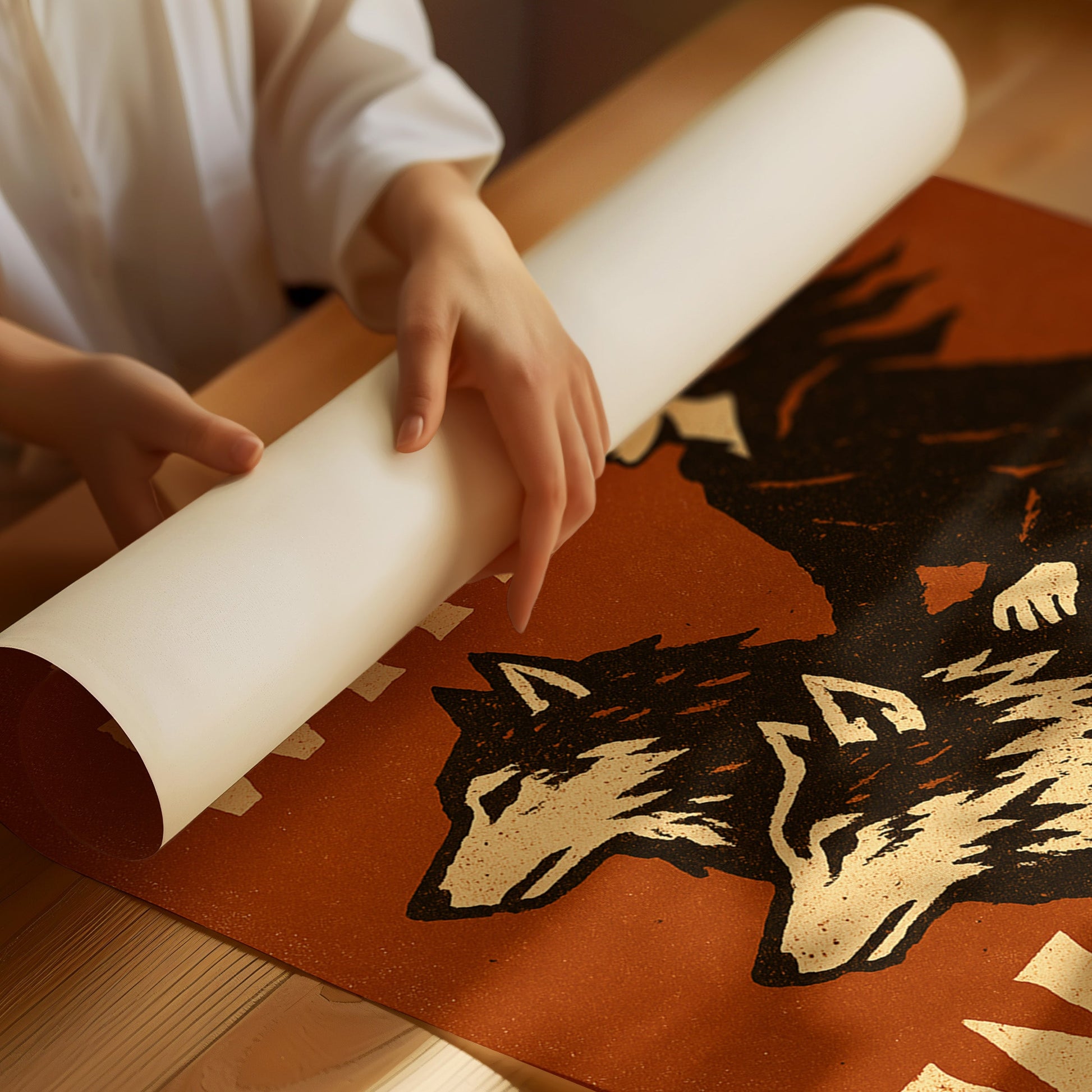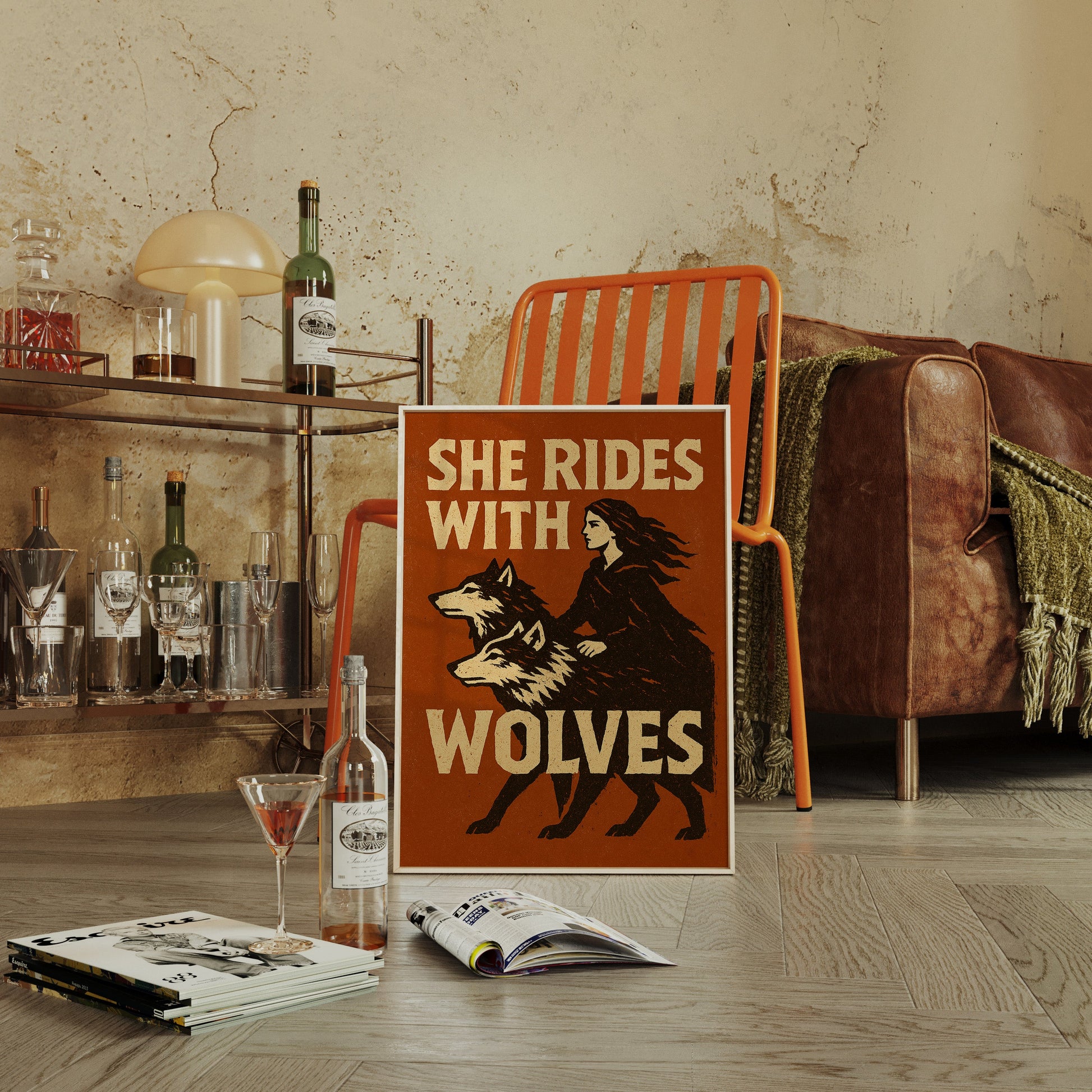 Fierce and untamed, this bold woodcut-style print honors wild feminine strength. A lone rider moves with her wolves, fearless against a rugged burnt sienna backdrop—perfect for the rebel spirit.