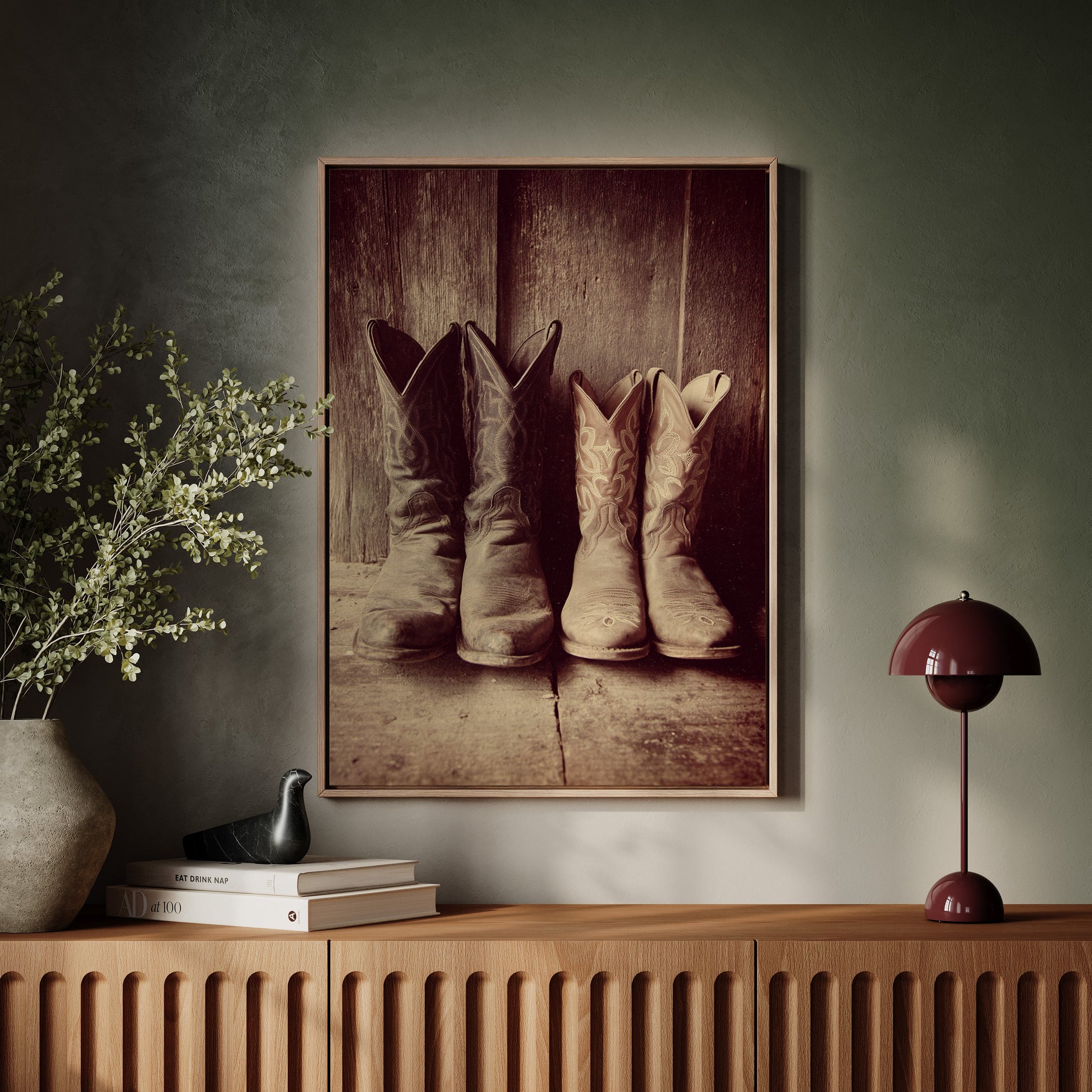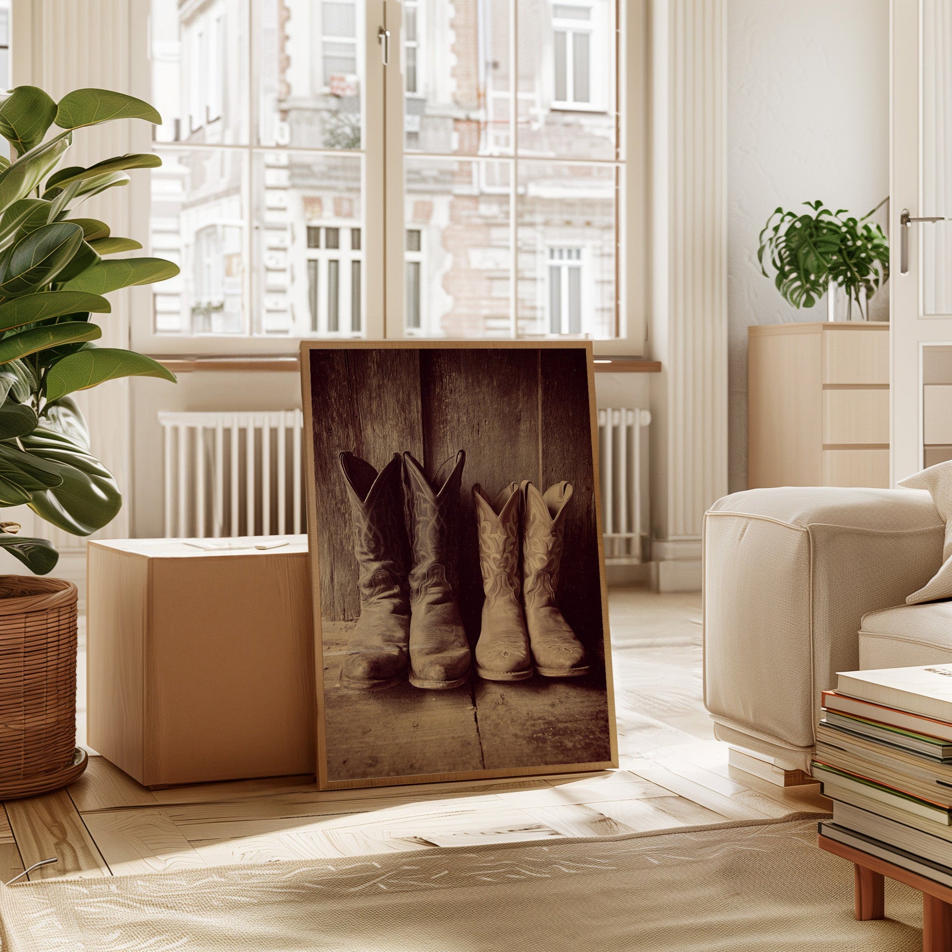 This photographic piece captures the essence of rustic Americana, drawing inspiration from the rugged beauty of the Wild West. The sepia tones lend an aged elegance, while the texture of the leather invites you to imagine the adventures these boots have seen.