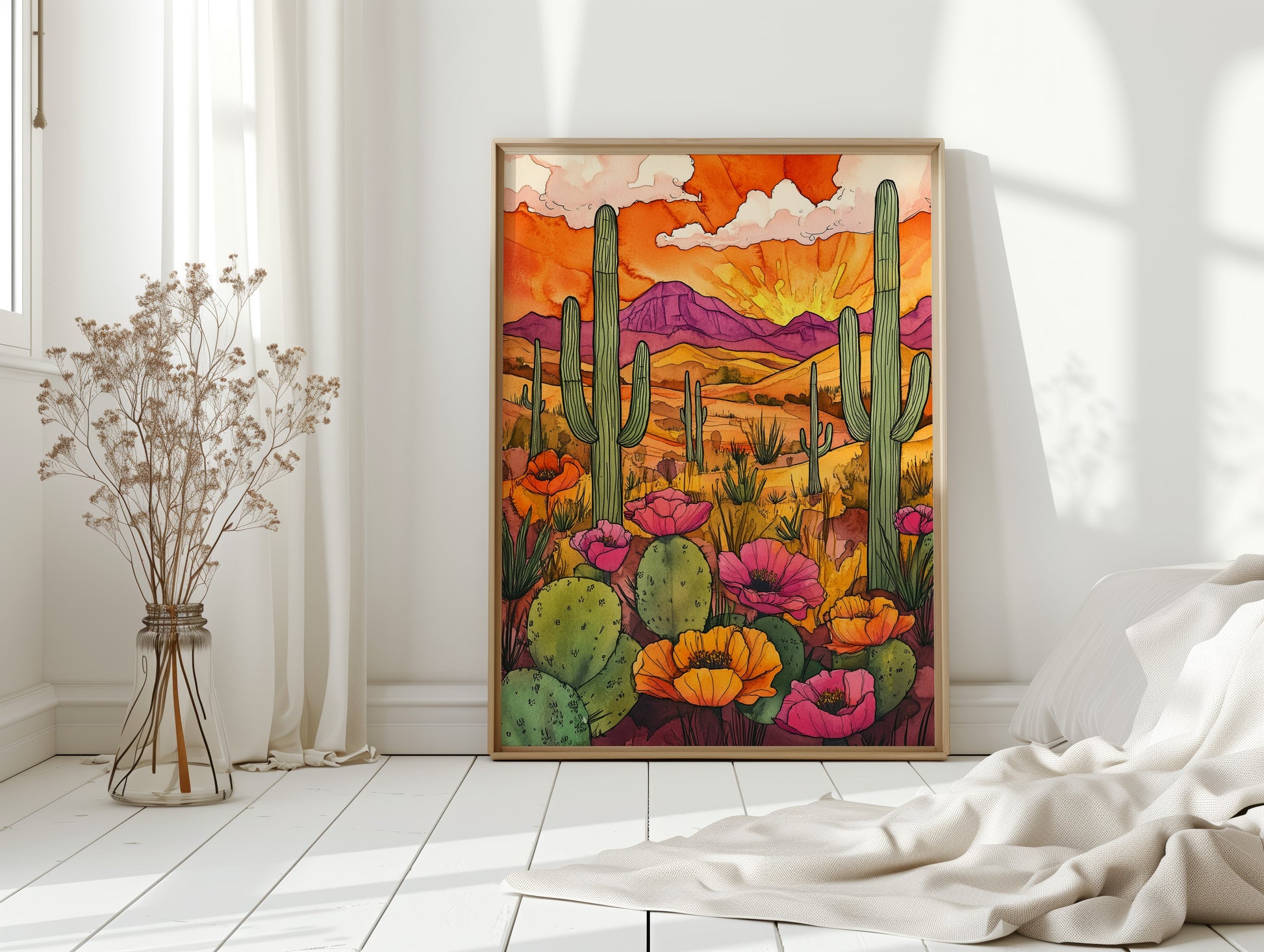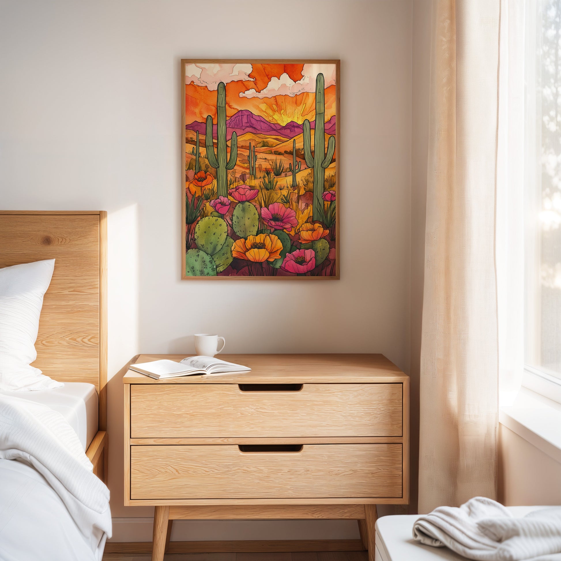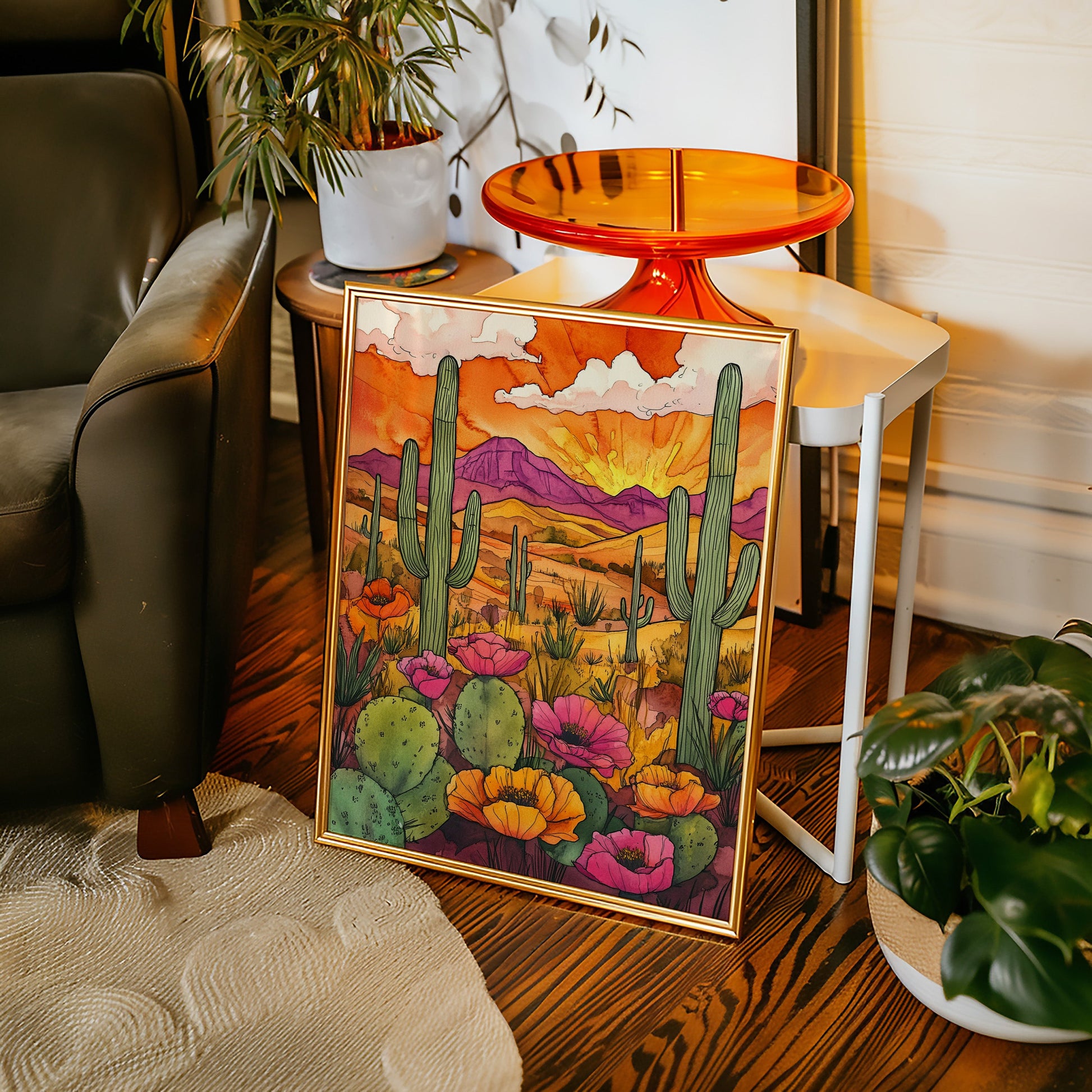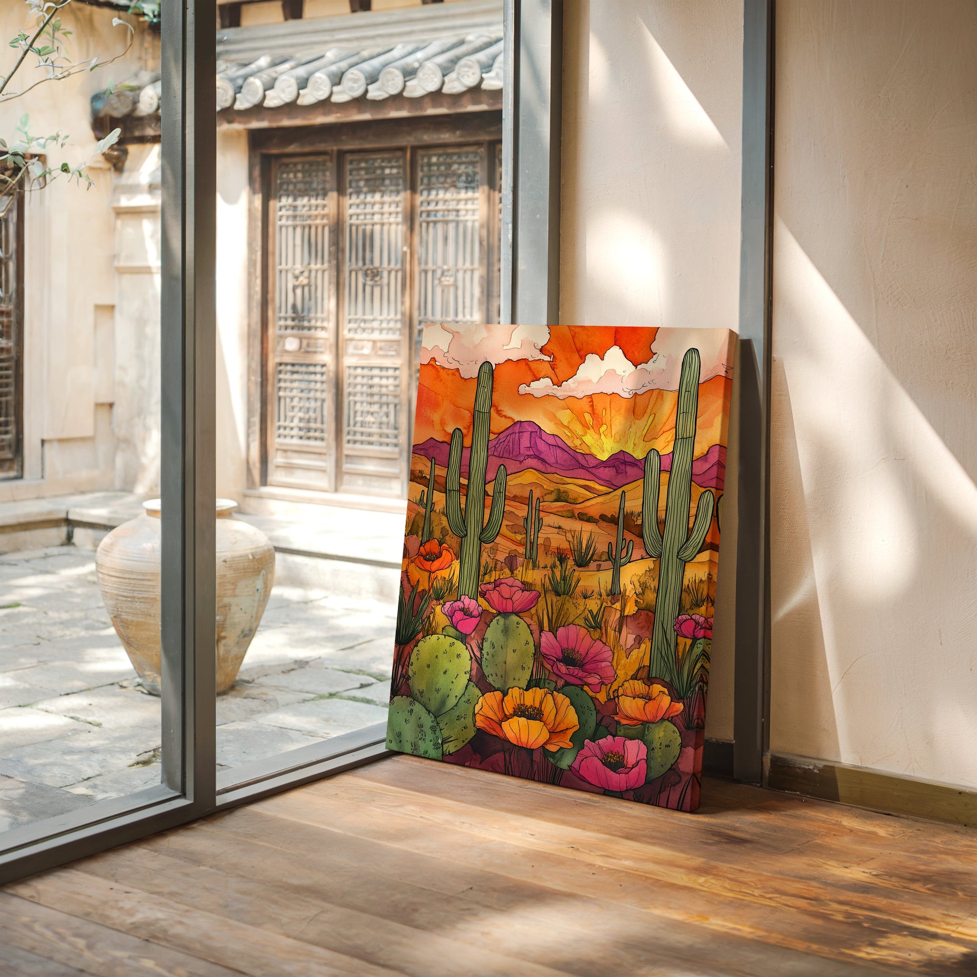 A vibrant sunset casts a warm glow over a desert landscape, where cacti and wildflowers thrive in vivid colors. Part of our Eclectic Bohemian collection, this piece captures the spirit of untamed beauty and adventure. Perfect for brightening up living rooms, study areas, or creative spaces. Each artwork is crafted with meticulous attention to detail, bringing the desert's allure into your home.