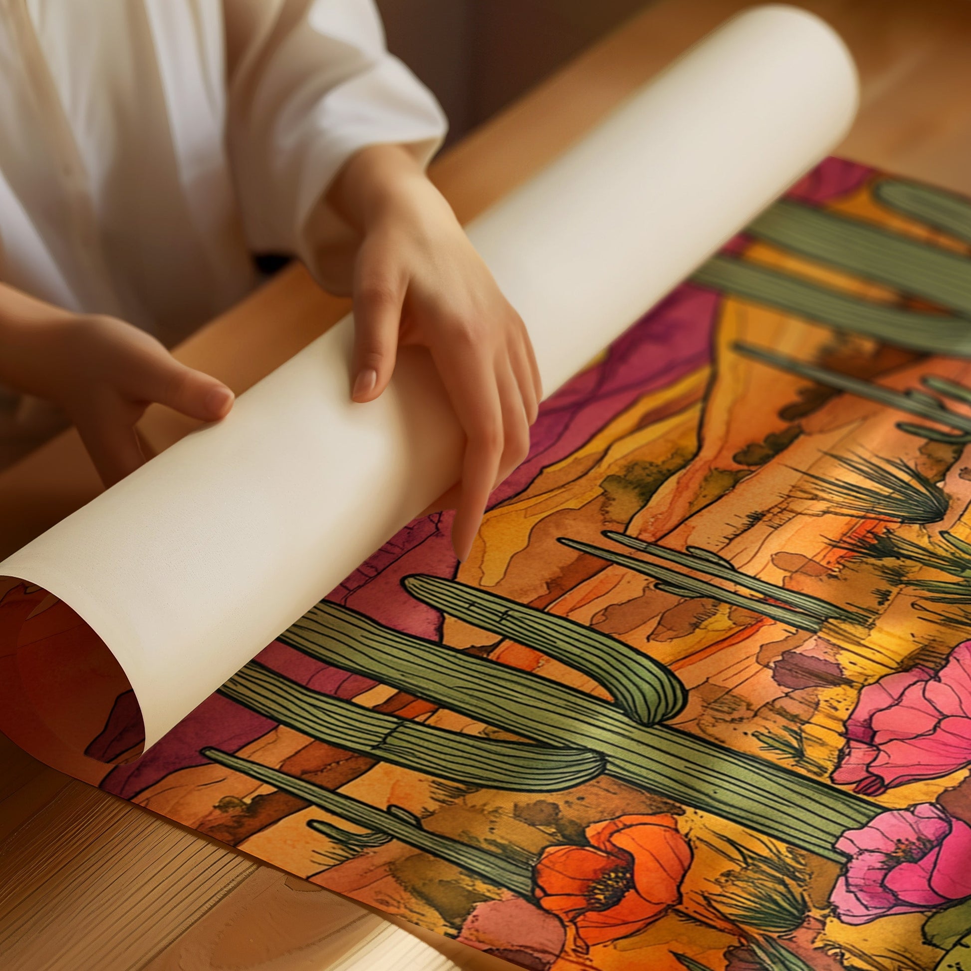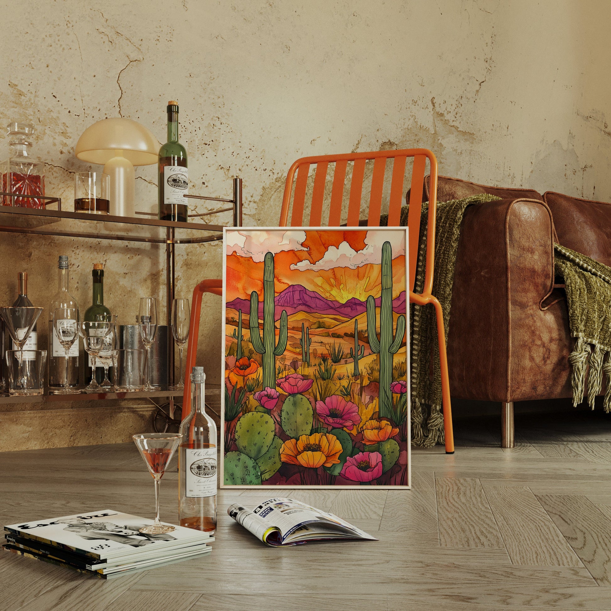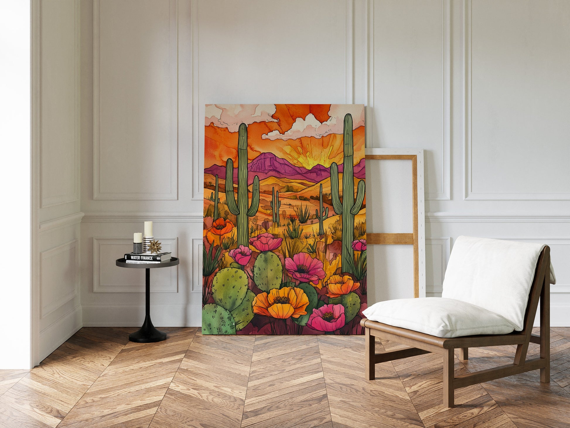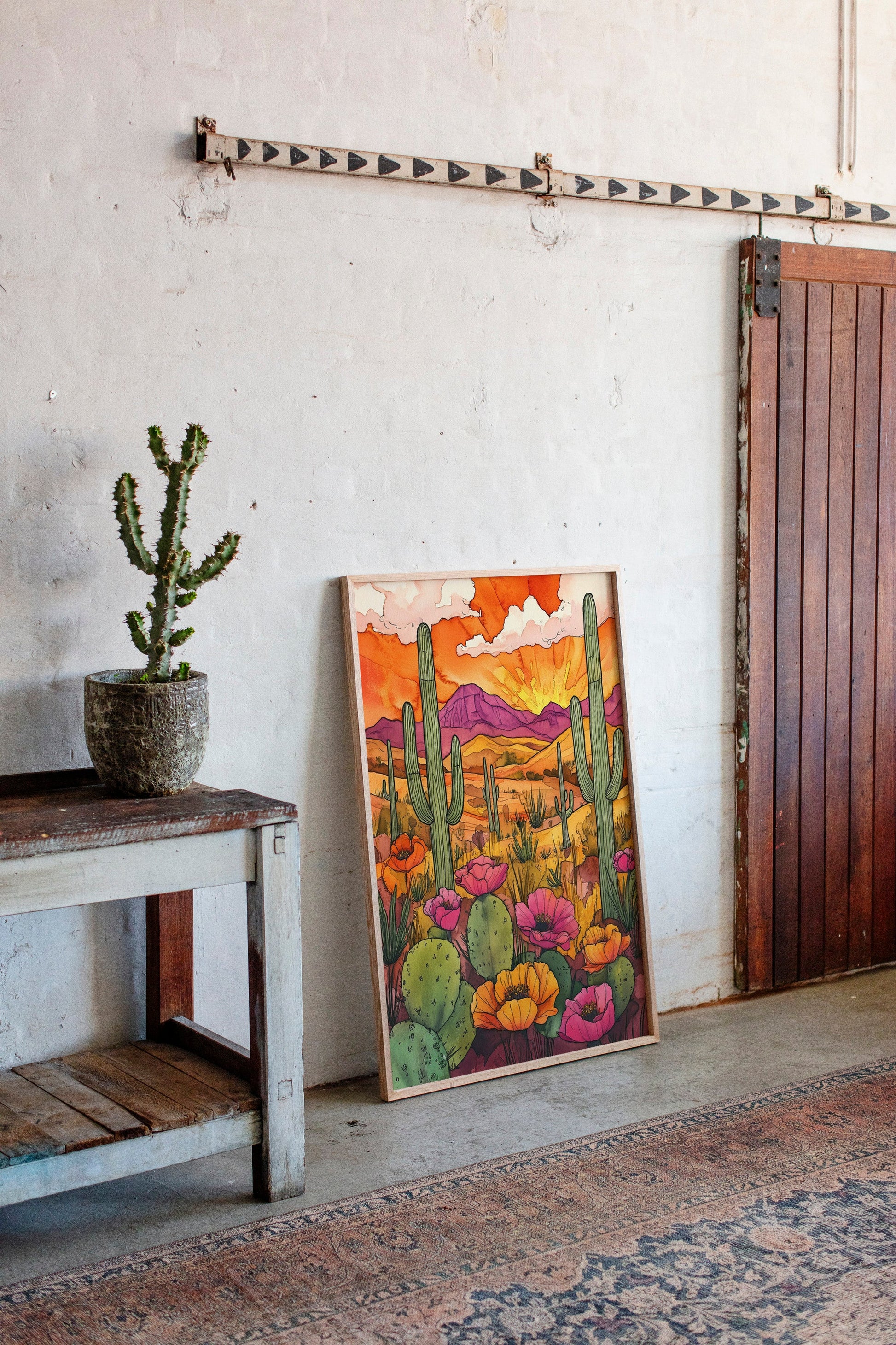 A vibrant sunset casts a warm glow over a desert landscape, where cacti and wildflowers thrive in vivid colors. Part of our Eclectic Bohemian collection, this piece captures the spirit of untamed beauty and adventure. Perfect for brightening up living rooms, study areas, or creative spaces. Each artwork is crafted with meticulous attention to detail, bringing the desert's allure into your home.