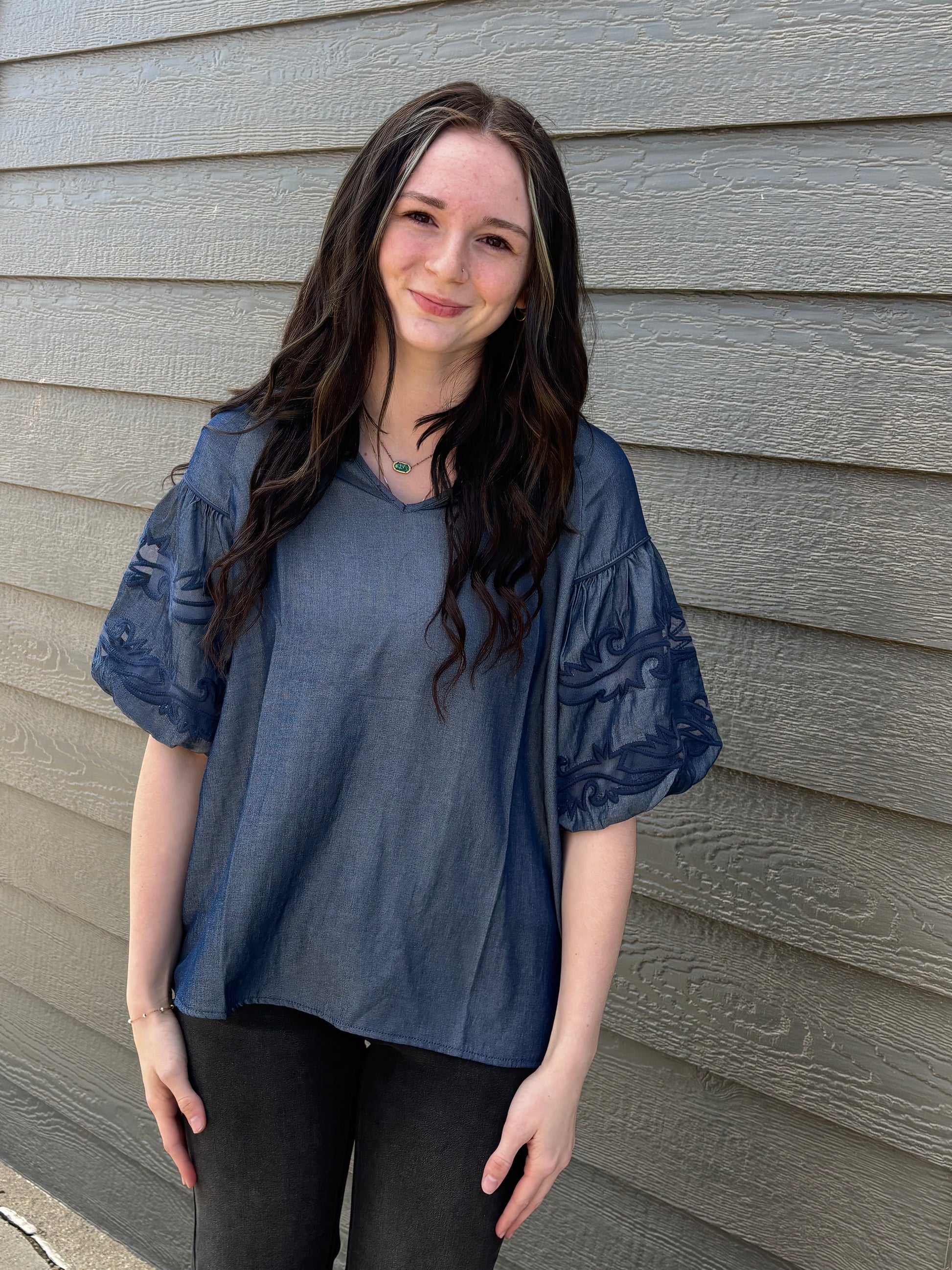 can we just take a moment for these sleeves... we love a good detail moment. this puff sleeve top has that boot stitching detail but done the two fly wayy. denim body with denim colored boot stitch effect is embroidered along with a mesh cutout.