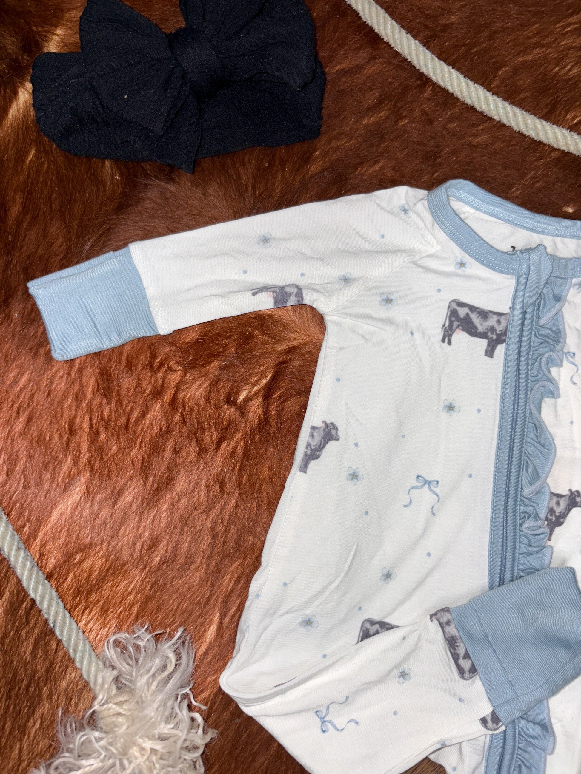 Round up the cuteness with our Danity Bluebell sleeper and matching two-piece set – perfect for your little cowkid’s adventures from nap time to playtime. Featuring a blue-and-white, Angus cow and bow print with sweet ruffle trim on the sleeper, this set blends cozy charm with western style.