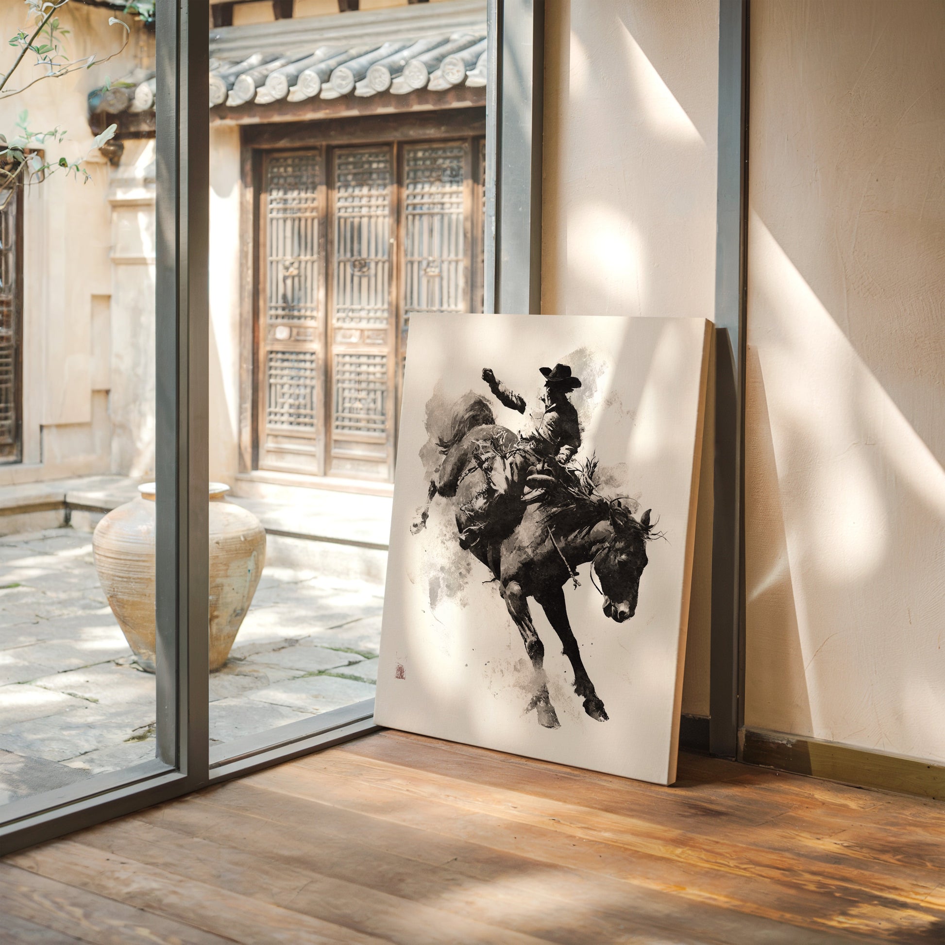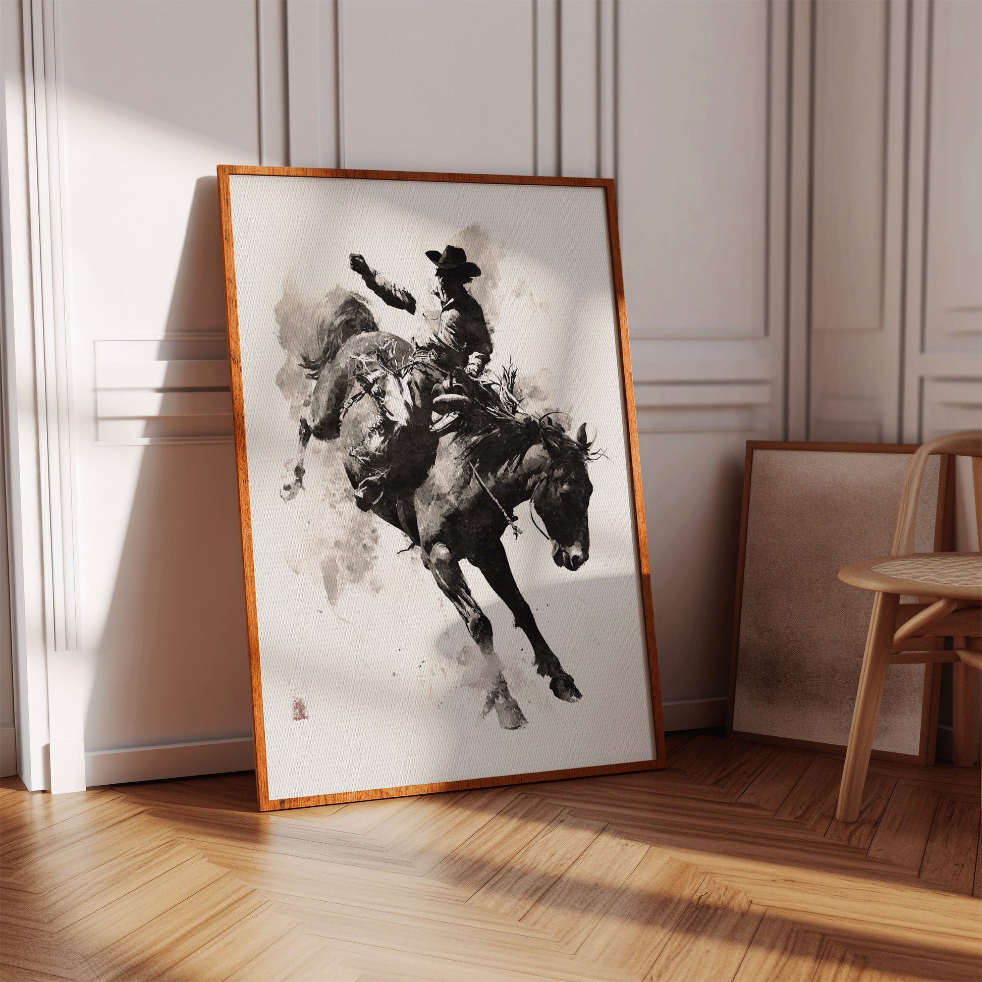 In the flowing dance between brush and paper, the wild energy of the rodeo arena comes alive with all its raw power and untamed spirit. This isn't just an illustration—it's poetry in motion, where every wash of ink captures the heartbeat of the ride and the courage of the rider.